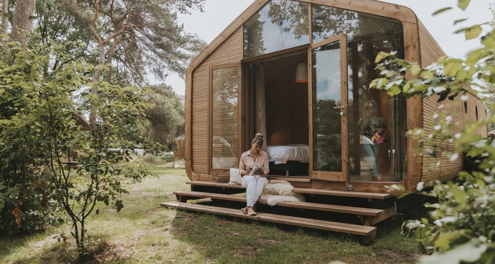 Natuurcamping De Lemeler Esch beschikt over de Trek-in; een luxe trekkershut volledig gebouwd van gerecycled en duurzaam materiaal. De Trek-in beschikt over een eigen douche, toilet en ingerichte keuken. Toch heb je door de grote ramen een gevoel van vrijheid, rust en ruimte en is het net alsof je volledig in de natuur staat.